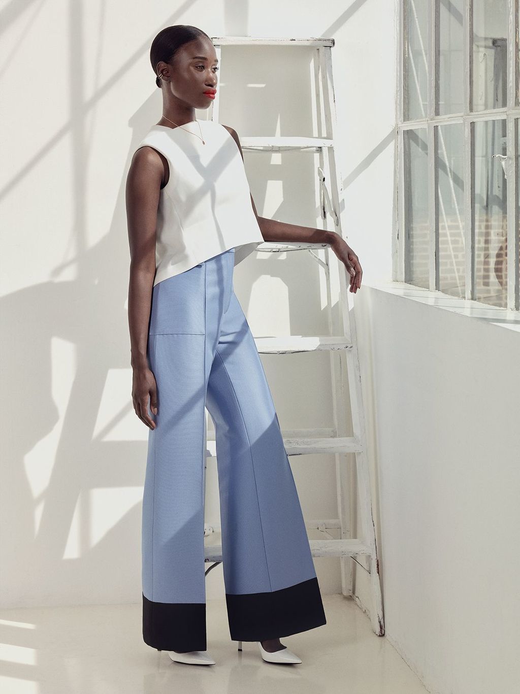 Amulette de Cartier necklace, Balenciaga top, Céline colorblocked trousers, Lanvin white patent-leather pumps.