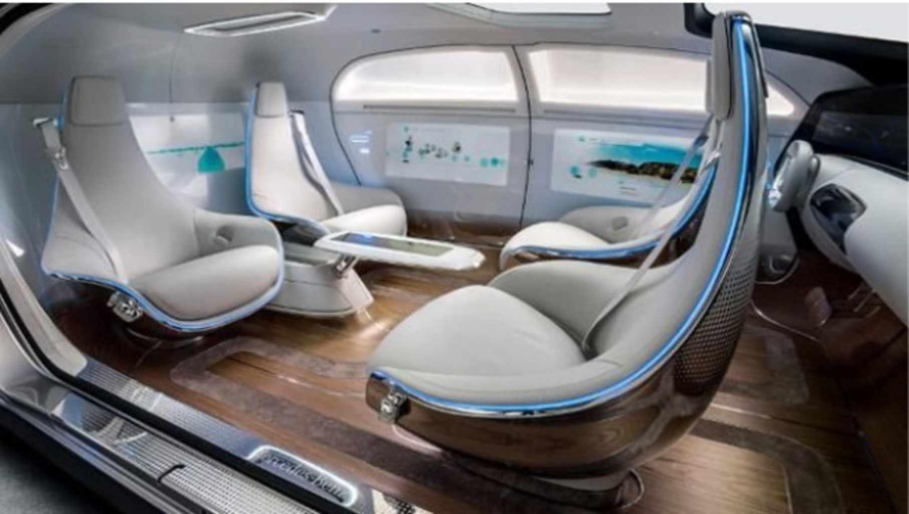 Autonomous vehicles will free the “driver” and passengers to socialize, have a business meeting, or learn more about the environment around them. Mercedes imagines a car that is more like a living room or boardroom on wheels. The driver and front passenger seats swivel to allow face-to-face communication.