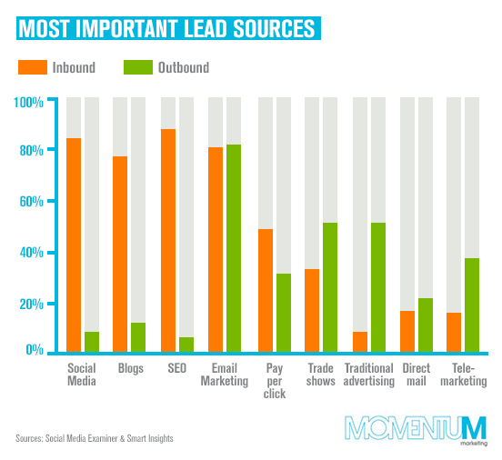 The second chart shows us what we would expect, but gives us one great insight that may not be immediately obvious: Email marketing is by and large the best marketing method. It drives an almost equal percentage of inbound and outbound leads at a very high rate. The trend in recent years has been very inbound marketing-heavy (e.g., social media, blogs, SEO), but hopefully this chart will steer some of that inbound energy back towards outbound email marketing as well.