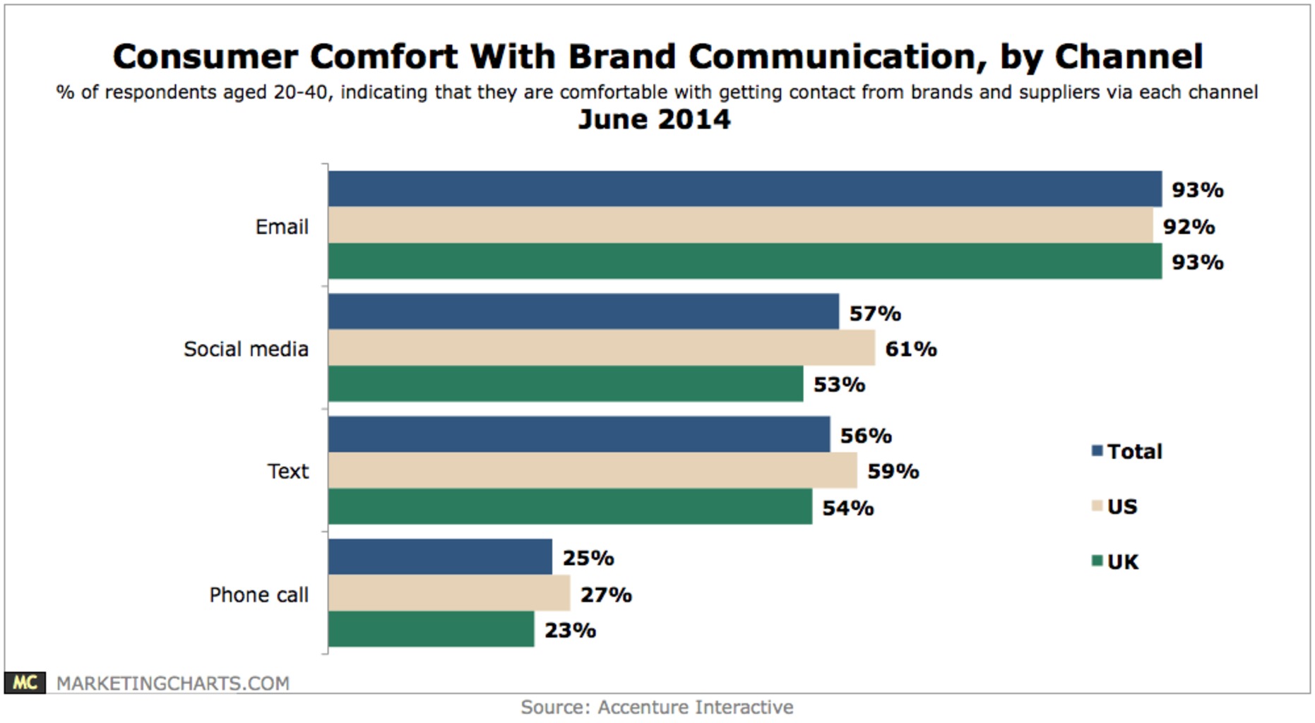 Consumers report the highest level of comfort when receiving email communications from brands.