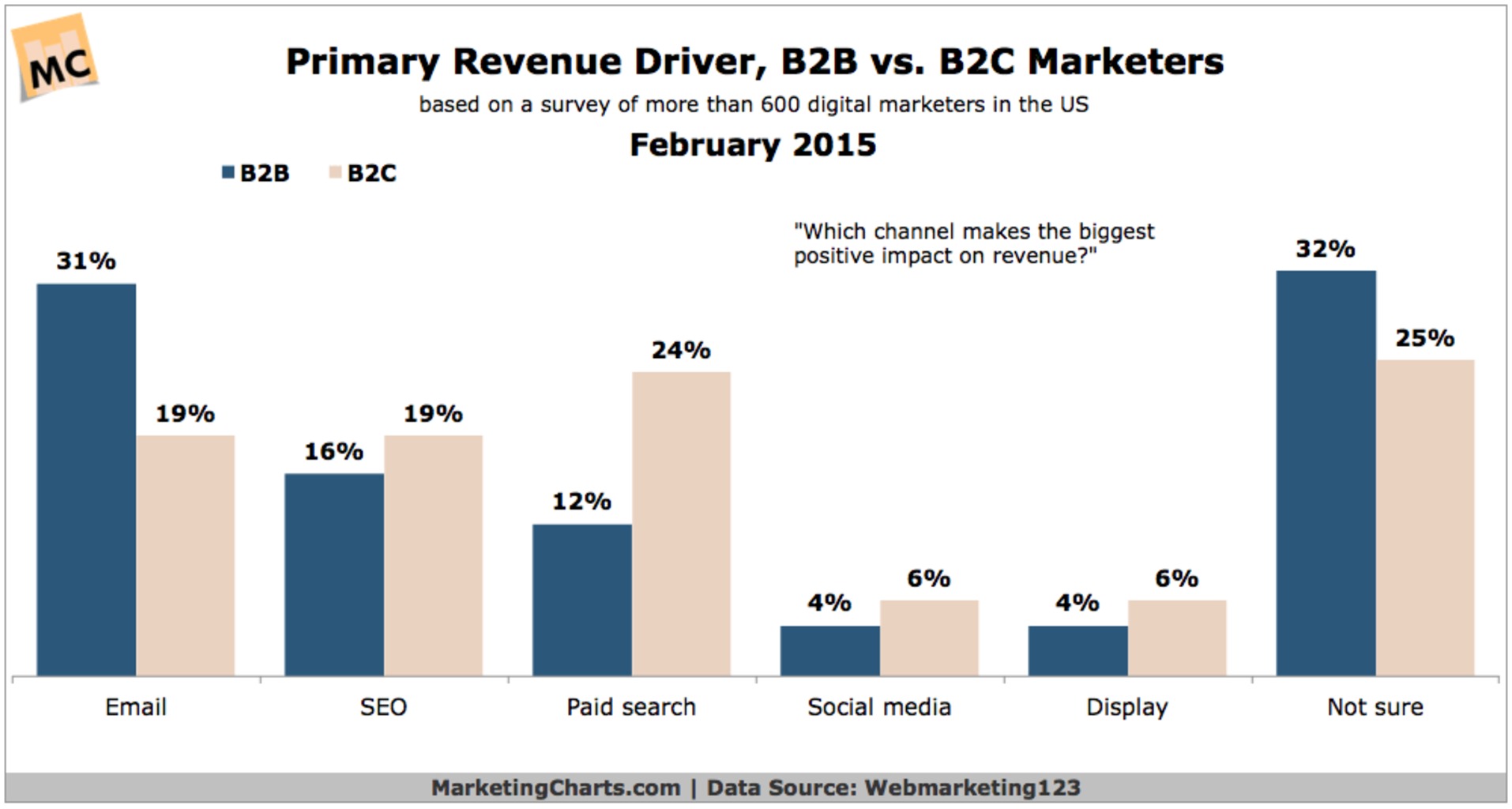 I have been painting a fairly one-sided picture in favor of email and mobile marketing, so let me dial back a bit and take a look at the big picture. I mentioned earlier that email is most effective for B2B marketing. This is true. It’s not true for B2C marketing, where paid search is still most effective.