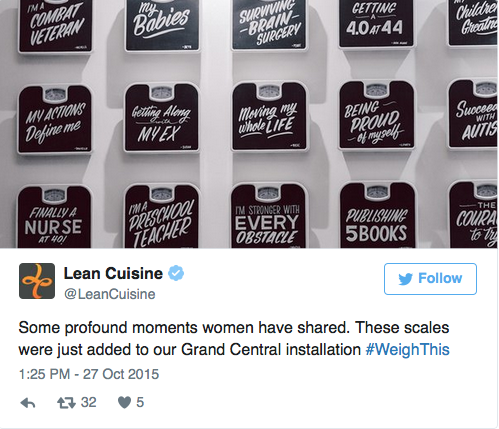 The #WeighThis campaign is part of a re-branding effort Lean Cuisine launched in June 2015 in partnership with 360i to move away from being perceived as a diet brand and more as a healthy lifestyle company.